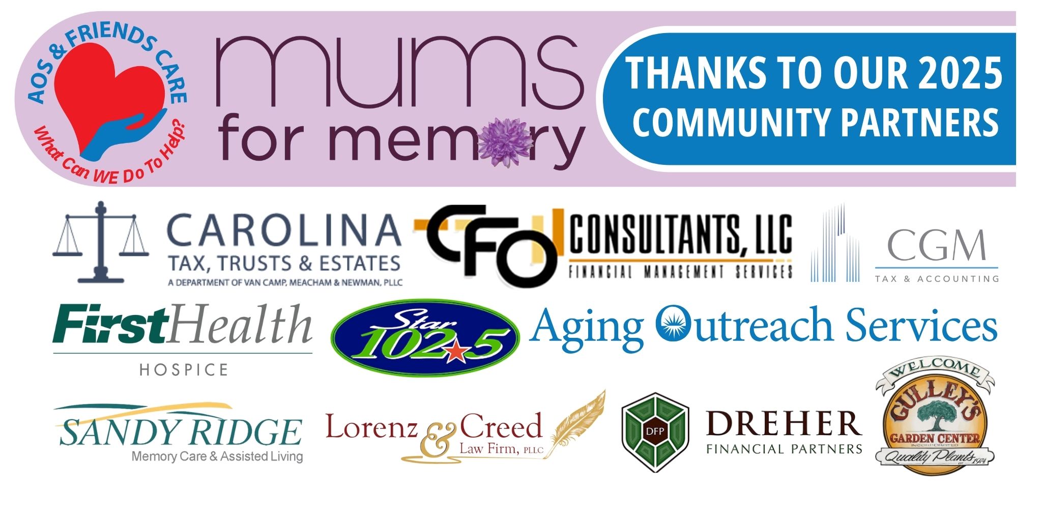 Mums For Memory™ Mums for Memory™ is AOS & Friends Care annual fall fundraiser event. Thank you for making our Mums for Memory™ 2025 a success! Although the 2025 event is over, donations are welcome at any time! All proceeds benefit the programs of AOS & Friends Care and are tax-deductible. Use the Donate button to the right to make your tax-deductible contribution and be a friend to someone with dementia. Questions? info@aosfcare.org Our 2025 Memory Wall… Thanks to all our 2025 sponsors and those who supported Mums for Memory™!